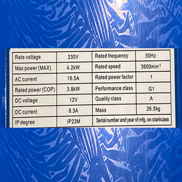 استارت دستی , تکفاز , سیستم خنککنندگی از راه پره , سیستم خنککنندگی از راه روغن , سیستم خنککنندگی از راه هوا , ولتاژ خروجی 12 ولت DC